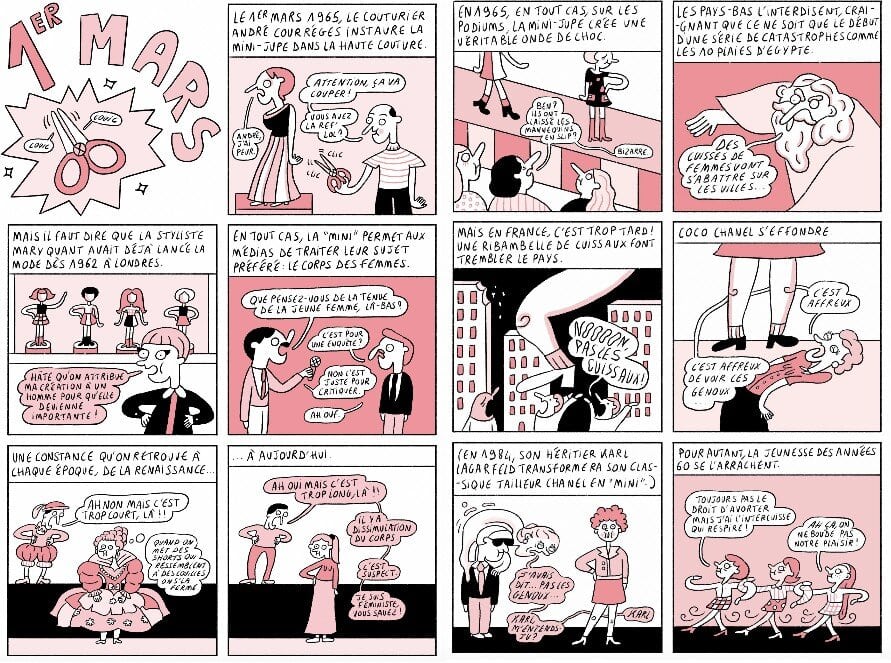 Par un prisme totalement subjectif et assurément féministe, Margaux Manchon nous fait revivre des moments cultes et des anecdotes de la culture populaire, de la pop culture, de l’Histoire de l’art ou de la littérature. Chaque date est racontée, synthétisée, croquée, caricaturée et analysée en quelques vignettes. Les personnages de Margaux Manchon, irrésistibles, ultra-expressifs, affublés de nez trop longs, aux profils déconfits, s’expriment sans détour ou en pensant trop fort. Piquante, drôle, désabusée ou révoltée, l’écriture est incisive et tellement réjouissante. L’ouvrage contient également des quiz en tous genres, qui permettent au lecteur de s’identifier au personnage ou au moment « clé » et d’obtenir des révélations sur sa vraie nature : Quelle fin du monde es-tu ? Quel Michel es-tu ? Quelle femme d’artiste es-tu ? Adoptant les codes du test des magazines « féminins », l’autrice nous aide à assumer nos contradictions – beauf et féministe, oui et alors ? – ou à renouer avec nos lectures d’enfances (Super Picsou géant, toi même tu sais).