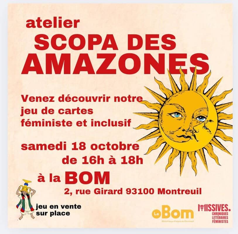 Il y a deux ans, les Missives se lançaient dans un financement participatif pour créer un jeu de cartes inclusif et féministe. La Scopa, jeu traditionnel italien où valets, cavaliers et rois brandissent leurs épées viriles et leurs bâtons menaçants, fut ainsi revisitée et entièrement redessinée pour devenir la Scopa des Amazones : les reines, les cavalières et leur progéniture non genrée rebattaient les cartes et participaient au renversement de l’ordre du monde. Des corps variés, aux corpulences et aux âges divers permettaient par le jeu d’aborder la question des représentations, dès le plus jeune âge : pour jouer à la Scopa, il suffit de savoir compter jusqu’à dix ! Un autre enjeu avait motivé l’équipe des Missives. Traditionnellement la Scopa était une affaire d’hommes attablés au café, occupant gaiement l’espace public et tapant le carton avec entrain. Où étaient les femmes? ni sur les cartes, ni aux tables de café, nous devions donc les faire (re)venir pour qu’à leur tour elles occupent sans frémir les espaces de socialisation auxquels elles ont droit elles aussi. 250 exemplaires plus tard, épuisés en une année, après des centaines d’heures de jeu, de débat et de rires – car nous sommes de celles qui militent dans la joie -, la mairie de Montreuil a souhaité soutenir notre projet et nos forces bénévoles en nous accordant une subvention exceptionnelle afin de rééditer la Scopa des Amazones sans avoir à repasser par la case ô combien épuisante du financement participatif. 300 exemplaires ont ainsi pu sortir de presse et, victoire, alors que lors de la première édition, nous avions dû nous résoudre à imprimer à Hong Kong pour assurer un prix de vente accessible à tous.tes mais au détriment de nos convictions écologistes, la Scopa nouvelle a été fabriquée en France, sortie des presses d’un imprimeur breton. Beaucoup d’entre vous ont déjà été initié.e.s à la Fête de la Ville, au festival des Murs à Pêches ou à la Journée des associations sur le stand des Missives. Pour celleux qui auraient manqué le coche, session de rattrapage samedi 18 octobre à la Bibliothèque des Objets de Montreuil qui nous accueille chaleureusement pour l’occasion. On vous y attend nombreux.ses, et vous pourrez même acheter le jeu sur place pour 15€ au lieu de 20€ pour la précédente édition (merci la ville de Montreuil!) : une belle occasion de nous soutenir, pour qu’on puisse continuer à vous proposer des événements littéraires de qualité et accessibles à tous.tes. A samedi prochain !