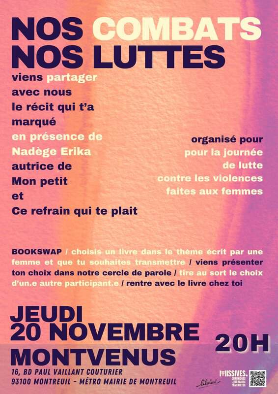 À l’approche du 25 novembre, journée internationale dédiée à la lutte contre les violences faites aux femmes, les Missives organisent un Bookswap en présence de l’autrice Nadège Erika (Mon Petit, Ce refrain qui te plaît). Le thème : nos combats, nos luttes. Le principe du Bookswap : choisissez un livre écrit par une autrice, venez le présenter brièvement au cercle de lecture et soyez prêt.e.s à vous en séparer. À la fin, on procède à un tirage au sort et on repart avec un autre livre que celui apporté !
