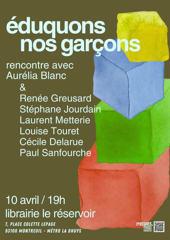 Le vendredi 10 avril à 19h, les Missives organisent une rencontre à la librairie Le Réservoir (métro La Dhuys) autour du thème de l’éducation des garçons de la naissance à l’âge adulte. Comment la famille, l’école, les copains socialisent les petits garçons en reproduisant les clichés sur une masculinité agressive et dominante, et comment faire pour contrer cela ?