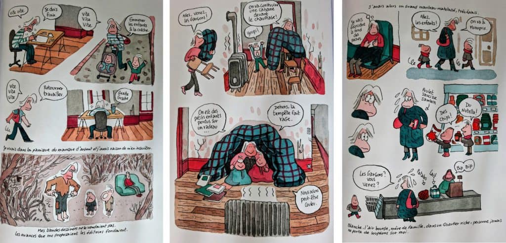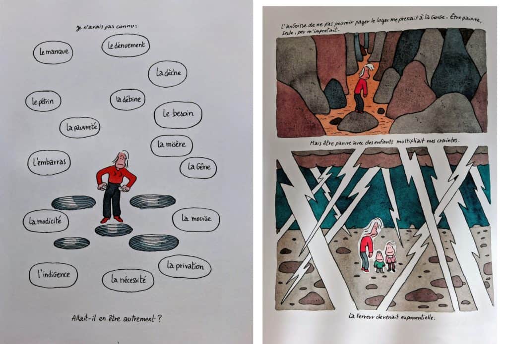 Ce que l’autrice montre avec brio dans des planches colorées et parfois cocasses malgré le caractère sinistre du récit, c’est que l’obsession de l’argent impacte tout, le manque gangrène le corps et le cerveau jusque dans les fantasmes et les cauchemars qui agitent les nuits de la jeune femme. Mal soignée, mal logée, mal nourrie, une confiance en elle réduite en miettes, la honte et la dissimulation au quotidien, le vol pour se nourrir, les stratégies pour trouver un endroit chaud où passer les journées d’hiver : la charge mentale de la misère pèse lourd sur les épaules des plus démuni.e.s. Et encore, Florence est-elle consciente d’avoir bénéficié d’un capital social et culturel, de pouvoir en cas d’extrême nécessité retourner vivre sous le toit familial. Certain.e.s n’ont pas cette possibilité. D’ailleurs, attention spoiler, elle s’en sort à la fin, combien de femmes restent quant à elles sur le carreau et deviennent vieilles et pauvres après avoir été jeunes et fauchées?